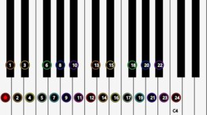 You’ve seen that there are twelve different notes available in a block of 12 piano keys, which we can label 0 to 11, with 0 being where we arbitrarily choose. These then repeat in several adjacent blocks. A scale typically uses some of these, including 0 (we call this the tonic). These distances determine the sound flavour of the scale. Different scale types are defind by different distances. Major scale requires distances 0 2 4 5 7 9 11. You’ve seen moving the scale around maintains these distances, and the sound flavour is the same, just higher or lower.